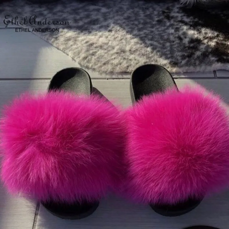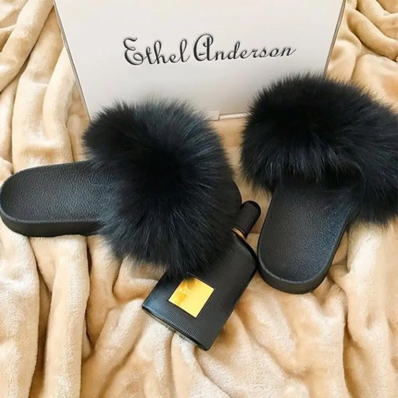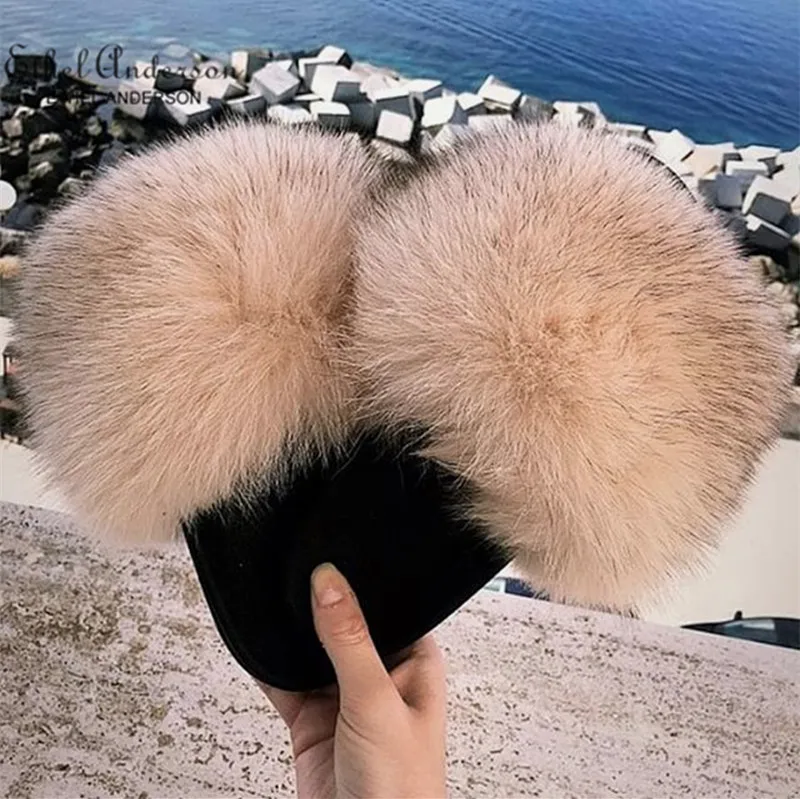 Genuine Fluffy Fox Fur Slides