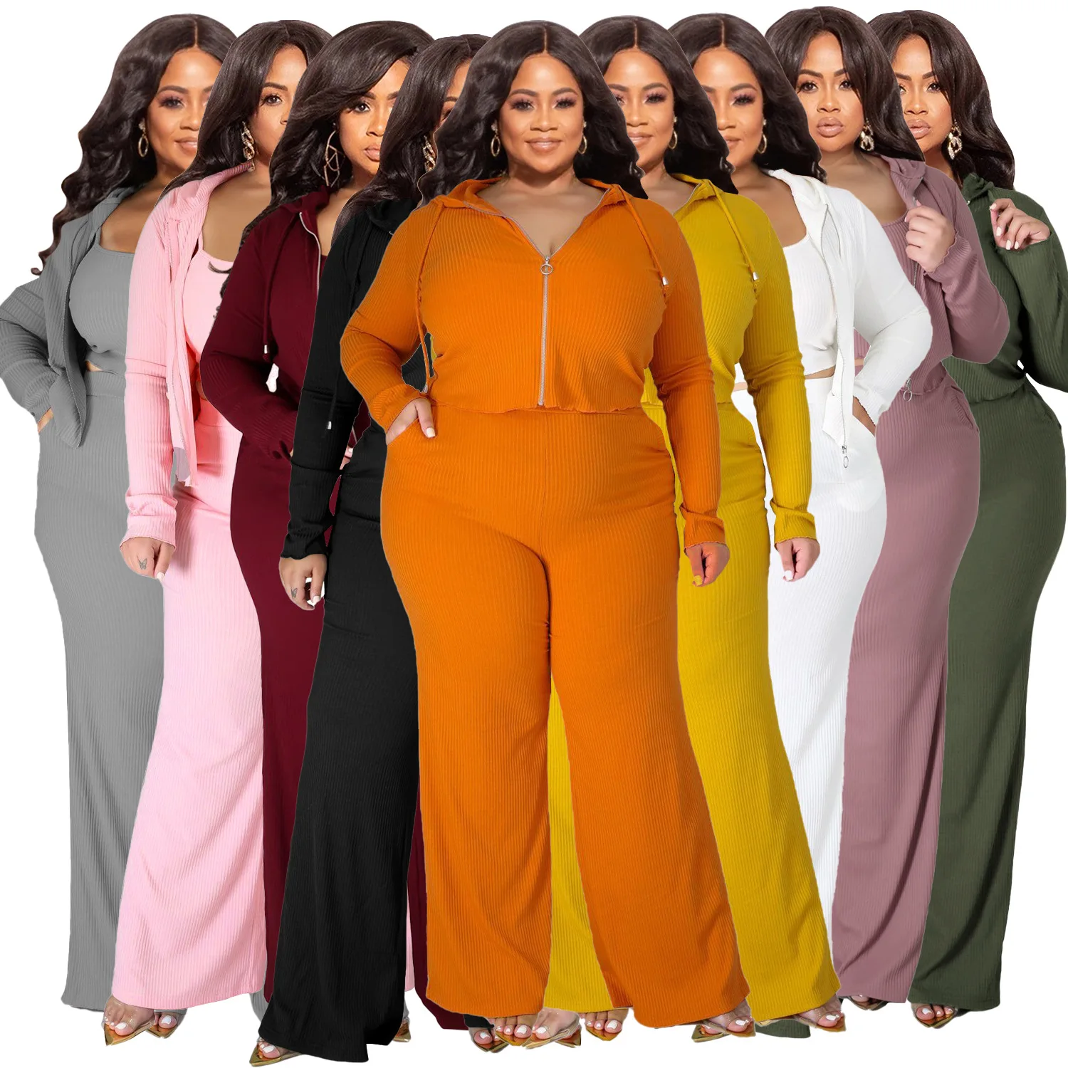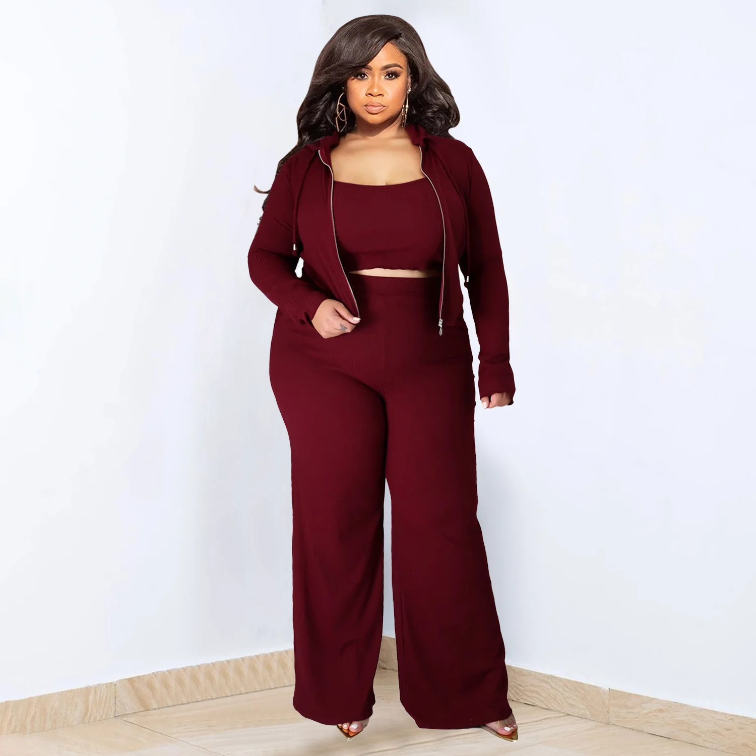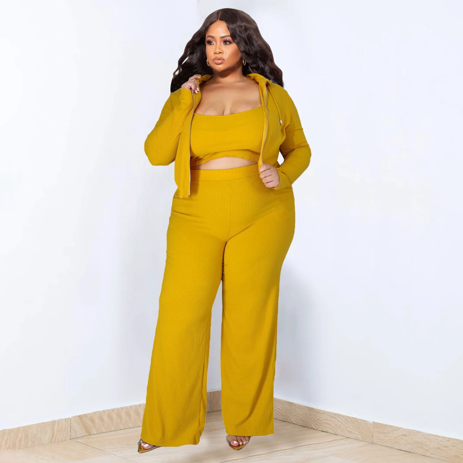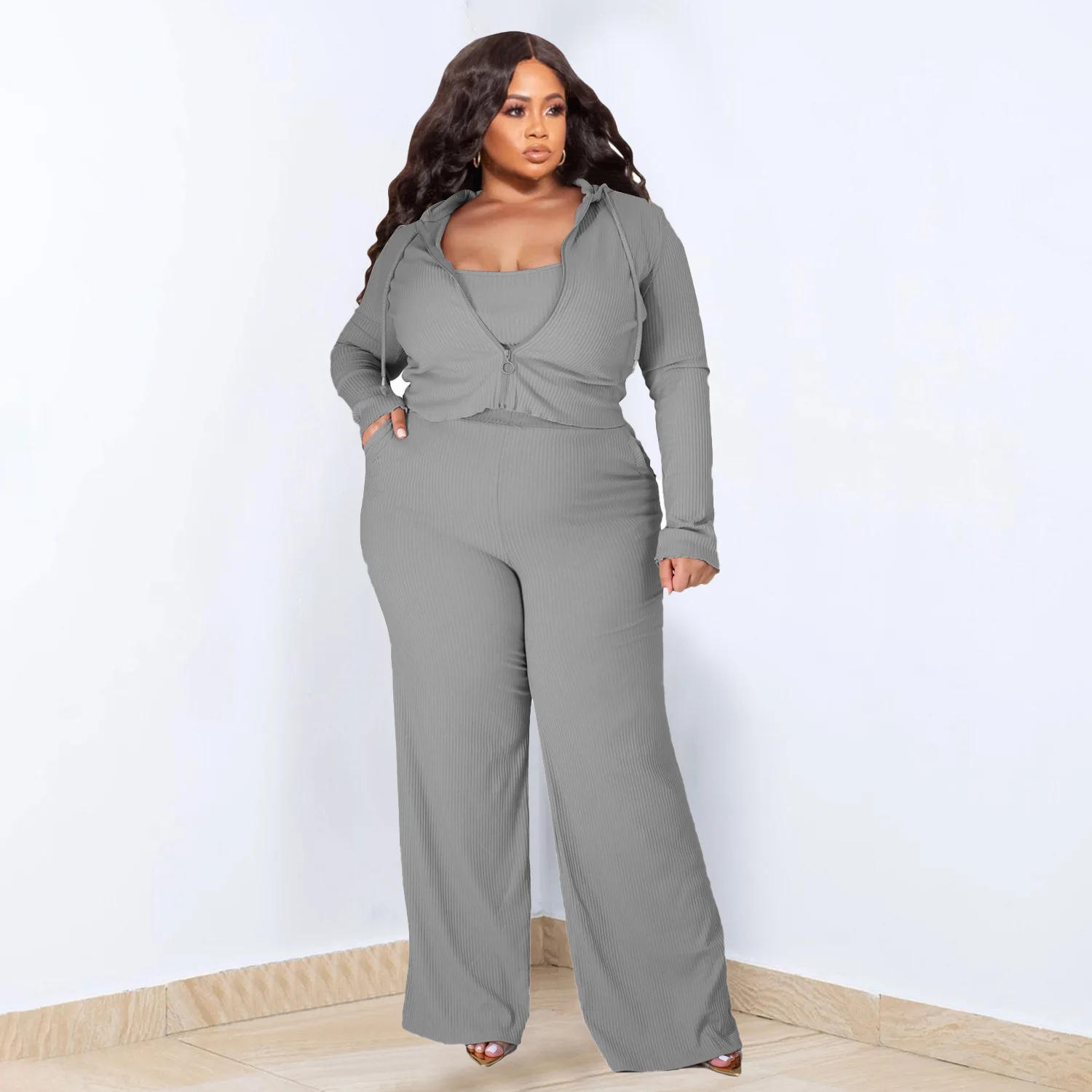 Plus Size Casual 3 Pieces Long Sleeve Zip Hooded Crop