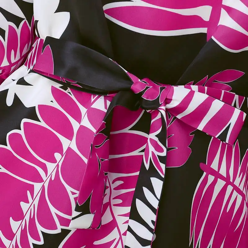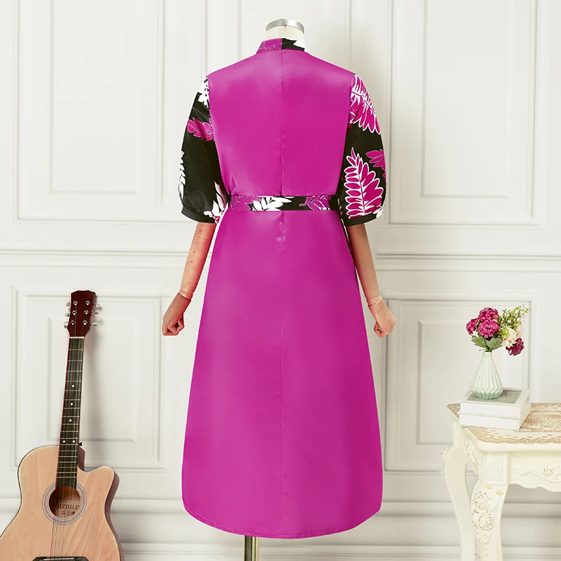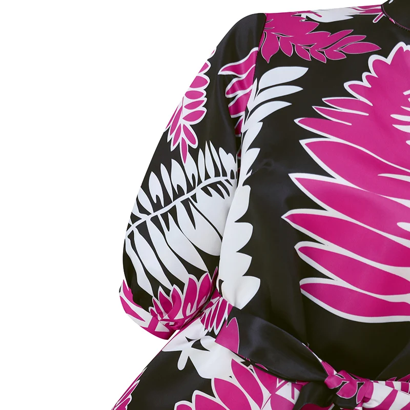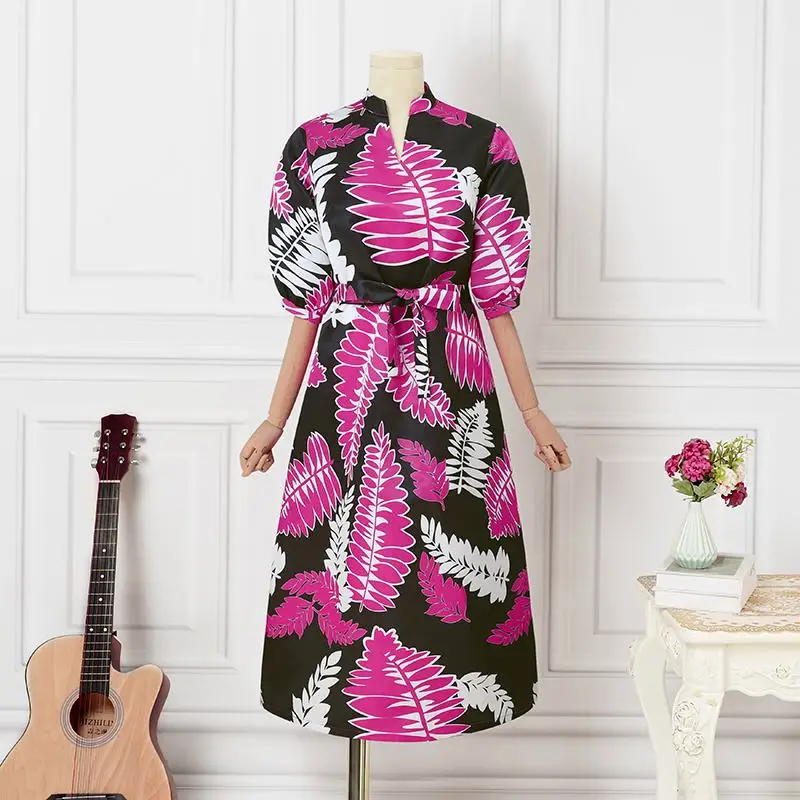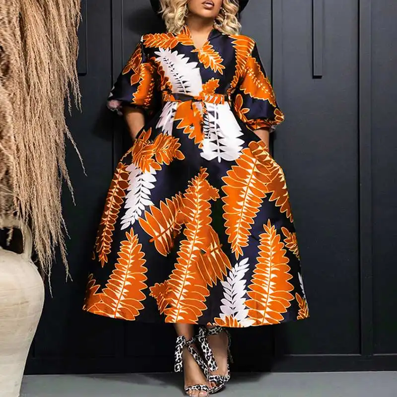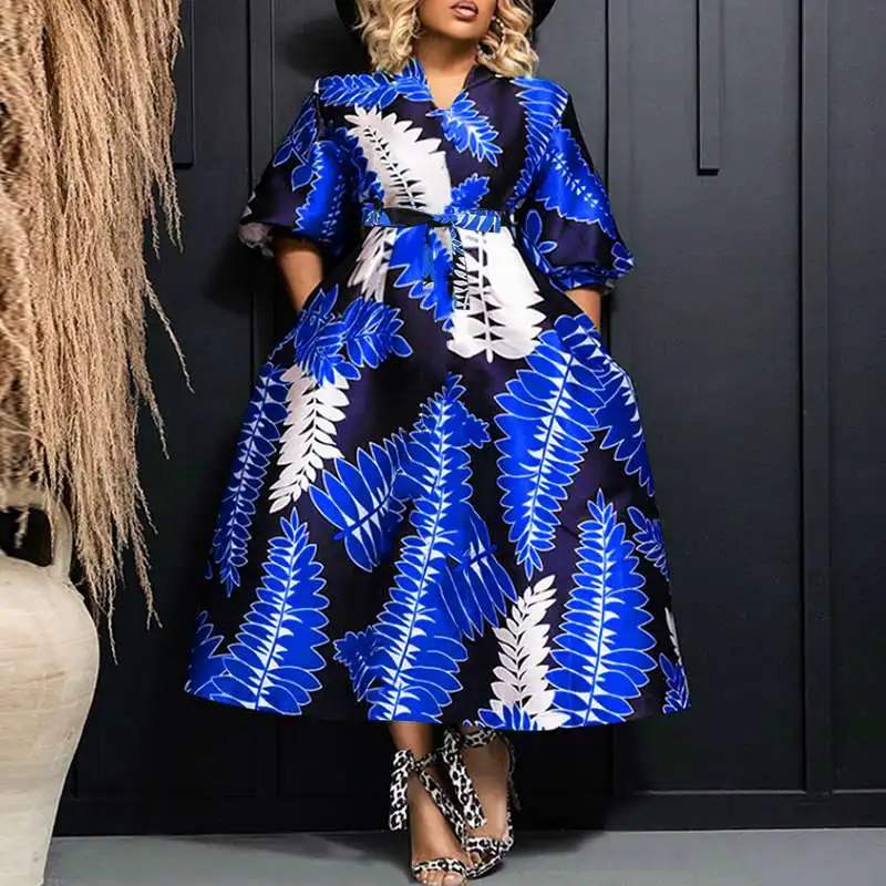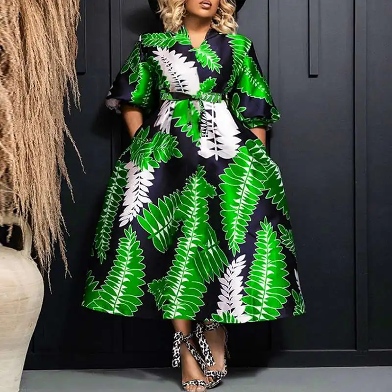 Plus Size Long V-Neck Printed Puff Sleeve Dress
